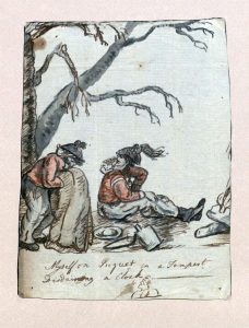 Lieutenant St. George also “drew caricatures uncommonly well, and I prevailed on him one day to draw himself and man in a violent passion, which he did so well, and so like, that everybody knew it immediately. Bernard, his servant, was lying on his back, and St. George, with one foot on his breast, flourishing a sabre over his head, telling him to say a short prayer, for that he had not more than a minute to live.” Bernard may have been Collins’ first name or one of the black retainers mentioned above by Hunter.[20]