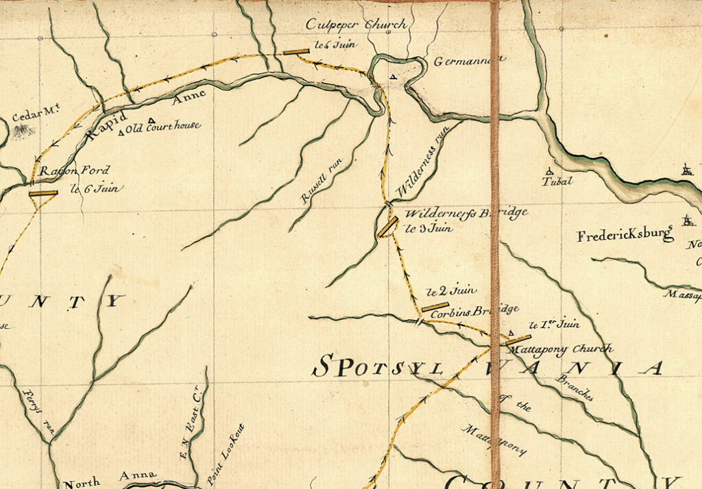 A particularly important source is a brief letter sent from William Constable, a Continental officer in the 9th Virginia Regiment and an aide-de-camp to Lafayette, to Capt. Thomas Drew, a long-serving Virginian from Caroline County. The June 4 letter was written from the army’s hasty camps along Wilderness Run. Because the message was intercepted by roving British dragoons, which “so outflank us . . . we can do nothing,” it was kept in British post-war archives with other papers related to the campaign. Notably, Constable wrote, “we will cross at Ely’s Ford today [emphasis added] to join Wayne,” whom they expected to join them with his Pennsylvanians any day.[8] This captured letter clearly states the army’s intention to move north to cross the Rapidan River at Ely’s Ford.