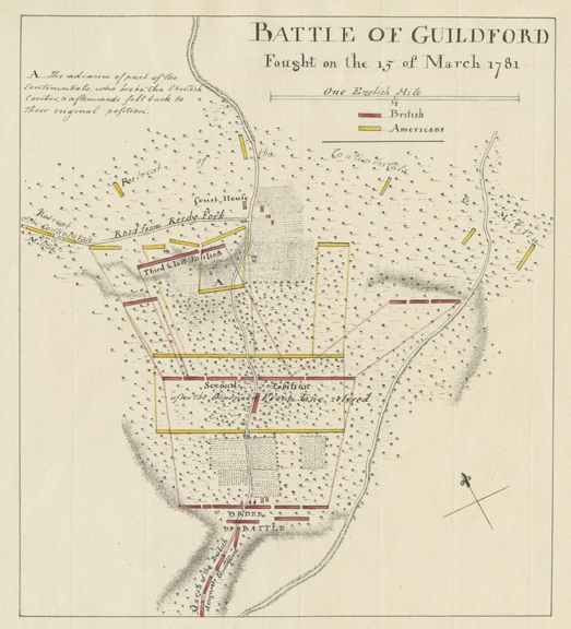 The second battalion of the guards, commanded by the honourable lieutenant-colonel Stuart, was the first that reached the open ground at Guildford Court-house. Impatient to signalize themselves, they immediately attacked a body of continentals, greatly superior in number, that was seen forming on the left of the road, routed them and took their cannon, being two six-pounders; but, pursuing them with too much ardour and impetuosity towards the wood in their rear, were thrown into confusion by a heavy fire received from a body of continentals, who were yet unbroken, and being instantly charged by Washington’s dragoons, were driven back with great slaughter, and the loss of the cannon that had been taken.[11]