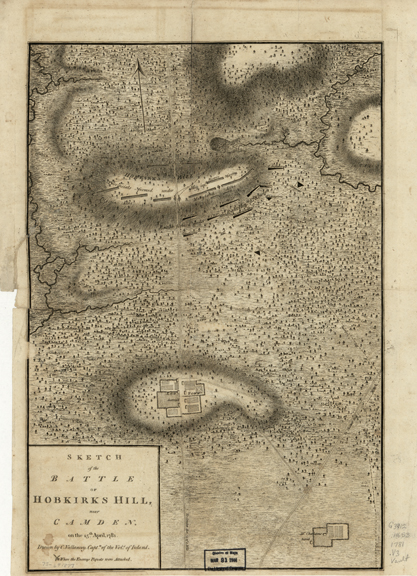 With this force, and two six-pounders, he boldly marched to attack the assailing army in their camp, in open daylight, at ten o’clock in the morning; committing the redoubts, and every thing at Camden, to the custody of the militia, and a few sick soldiers. The enemy were posted about two miles in front of the British lines, upon a very strong and difficult ridge, called Hobkirk’s hill. By filing close to the swamps on their right, the British columns got into the woods unperceived, and by taking an extensive circuit, came down on the enemy’s left flank, thus depriving them of the principal advantage of their situation. They were so fortunate . . . that they were not in all this course discovered, until the flank companies of the volunteers of Ireland, which led the column, suddenly poured in upon their pickets: These, though supported, were almost suddenly driven in, and pushed to their camp.[29]