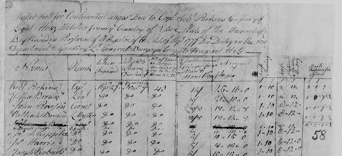Five months after the Saratoga campaign, as no provision had been made to reimburse “any Detachm[ent] of Light Horse that has ben detached or recomm[ded] to march to reinforce the Continentall Army,” those mounted troops who had served were approved to receive the same pay and rations granted to light horse in the Continental Army.[24] A muster roll in the Massachusetts State Archives “for Continental Wages Due to Cap’t Rob.t Perkins Company of Light Horse Volunteers of the Reg’t of Militia Commanded by Maj. Charles Smith,” pictured here, includes columns for “horse Shewing,” listed for all as one pound, ten shillings regardless of rank; “horse Rations in Shilling Per Day” at eight pounds, twelve shillings each, four shillings a day for the forty-three days that they served; and “Back Rations for officers,” for Captain Perkins, Lt. Elisha Brown, Cornet John Pearson, and Quartermaster Palatiah Brown.[25]
