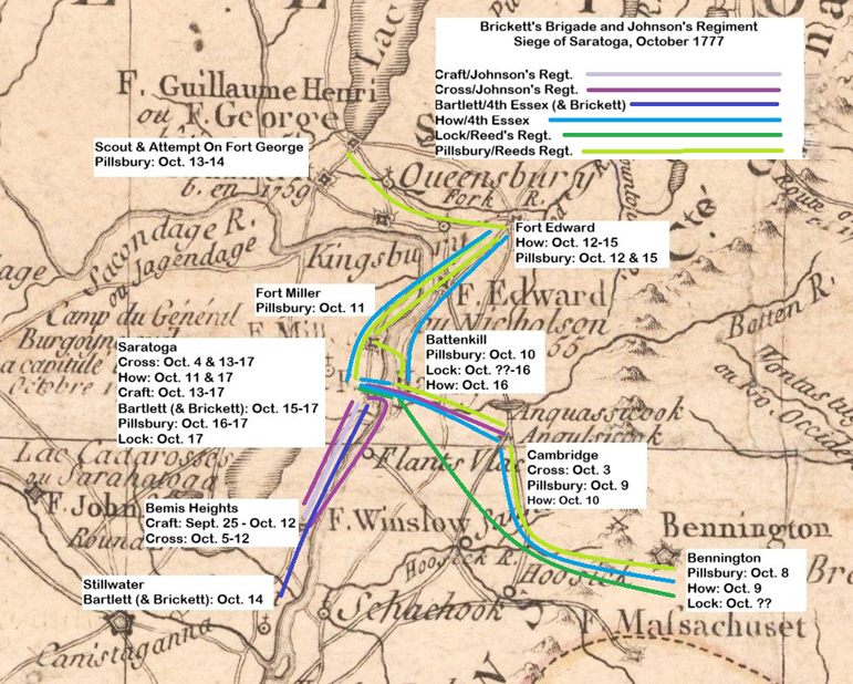 When Brickett arrived at Saratoga, companies from at least two of the regiments attributed to his brigade were positioned on the east side of the Hudson River, as far north as Fort Edward. In Reed’s Middlesex Regiment, Benjamin Lock, with Capt. Samuel Farrar’s company, noted in his journal that after passing through Cambridge, New York, he went to “head quarters att Saratoga” and camped at “a place cald Batenrill.”[38] Buttrick’s company “arrived at Saratoga on the 10th, where they encamped two days. The 13th they went to Fort Edward. The 14th and 15th, went out on a scout, and the 16th brought in fifty-three Indians, several Tories (one of whom had 100 guineas), and some women.”[39] Joshua Pillsbury, with Capt. Joseph Varnum’s company, arrived at Fort Edward on October 12. On October 13 he recorded “Skoouted towards the Lake and Brought in Several prisoners,” and the next day “Marched and Skooute to Lake George to Take the Fort but could not,” so they returned to Fort Edward on October 15.[40] How, with the 4th Essex, wrote in his diary that he too arrived at Fort Edward on October 12, remained there until October 15, noting that day: “This morning our Scouts Brought in upwards of 50 Indians that ware made prisoners Yesterday Near Fort George,” and on October 17, “This morning we march’d To Salletoga with all the Reg’t.”[41]