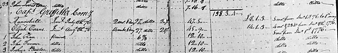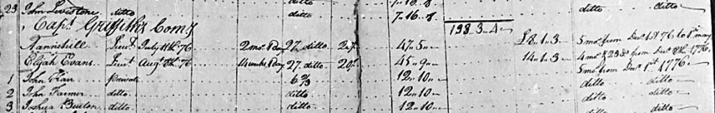 In early December 1776, Gen. George Washington provisionally grouped the Maryland and Virginia remnants of Rawlings’ regiment not captured at Fort Washington into two composite rifle companies commanded by the unit’s highest-ranking officers still free—Capts. Alexander Lawson Smith and Gabriel Long.[12] Long’s composite company comprised all the Virginians still at liberty, while the Marylanders formed the core element of Smith’s composite company, which included Philemon Griffith’s unit (with Elijah Evans). There are few records of this small element during the chaotic period of the Trenton and Princeton campaign, but as soon as the situation stabilized in northern New Jersey in the spring of 1777, steps were taken to provide a clear paper accounting. On May 1, the army staff prepared a payroll for Smith’s composite company, carrying all relevant data for the period December 1, 1776, to April 30, 1777.[13]