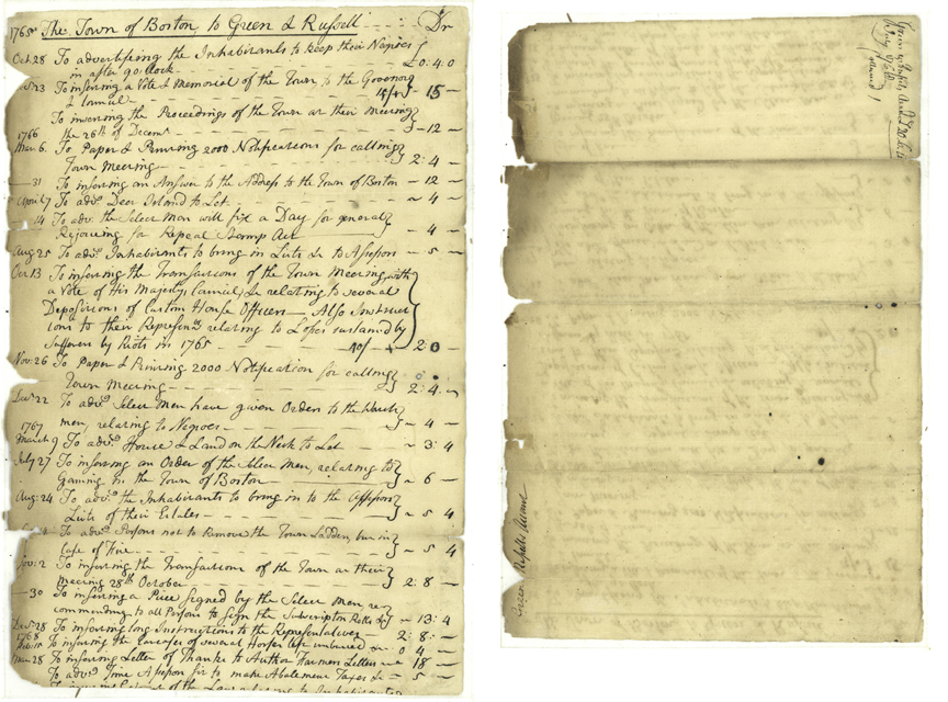 The answer is reflected in a previously unpublished invoice issued by the printing firm Green and Russell, publishers of The Boston Post Boy and Advertiser, to the town of Boston for printing and publishing services.[3] The title of the invoice reads, “The Town of Boston to Green & Russell, Dr”[4] (Figure 1A). The document records a number of transactions from 1765 to 1768, during which the town placed a series of advertisements and notices in the firm’s newspaper. Each entry lists the date, subject, and cost of the transaction.[5] On the reverse side is written, “Green & Russell Recd. £20.6.4 July 1768 (allowed)” (Figure 1B).