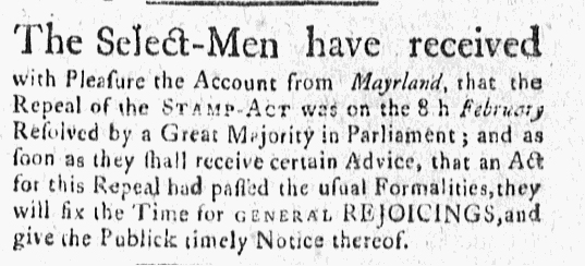 One example of the concurrence between an invoice item, its authorization in the Minutes of the Selectmen’s Meetings, and the published advertisement in The Boston Post Boy and Advertiser, calls for the people to celebrate the Repeal of the Stamp Act. The Minutes for the Selectmen’s Meeting for April 14, 1766 include: “A letter from the Sons of Liberty relative to the repast of the Stamp Act was read. Whereupon Voted that the following Advertizement be sent to all of the Printers – The Selectmen.”[15] The corresponding entry in the Green and Russell invoice for April 14 states, “To Adv. The Selectmen will fix a Day for general Rejoicing Repeal Stamp Act.” The published advertisement in the Boston Post Boy and Advertiser for April 14 is shown in Figure 3.
