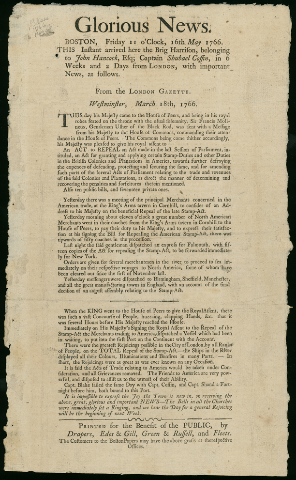 [6] Boston Post Boy and Advertiser, April 8, 1765: “Last Wednesday Evening arrived here the Ship London Packet … by whom we have the following Extraordinary Intelligence. viz … The Honorable House of Commons on the 7th of February passed 55 Resolves, which we hear are since passed into an ACT OF PARLIAMENT – The Resolves are for imposing certain STAMP DUTIES in America … For every NEWS-PAPER, or pamphlet, containing half a sheet, One-half penny. For every whole sheet, ditto, one penny. For every advertisement, Two shillings.” Additionally, virtually every legal and commercial document required a stamp.
