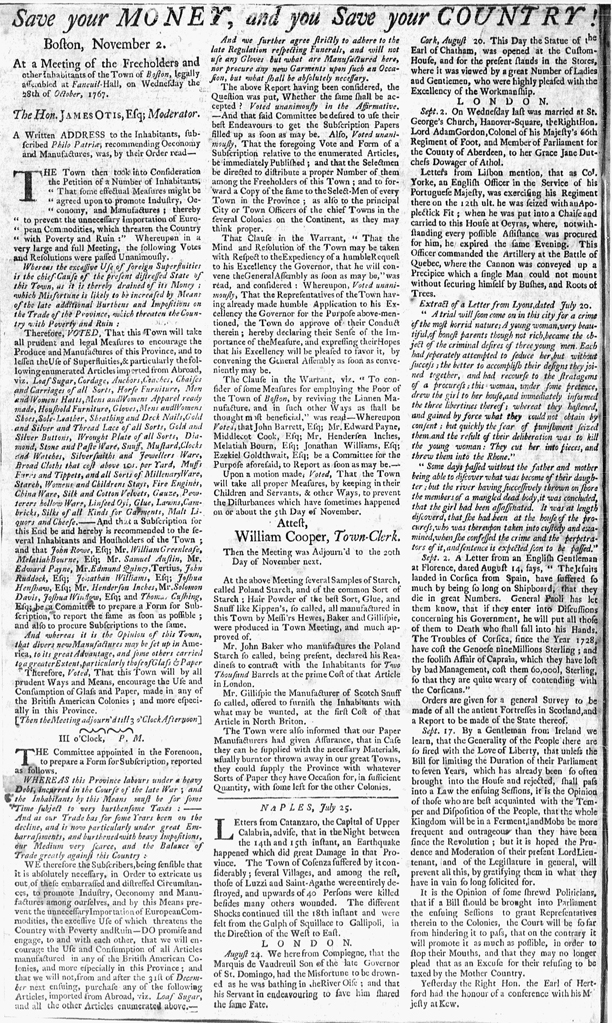 The most eye-catching item (#16) was an appeal to the townspeople to sign the subscription pledging to “promote Industry, Oeconomy, and Manufactures: thereby to promote unnecessary Importation of Europe Commodities which threaten the country” (in essence, a non-importation agreement). It was the only published item with a “banner” title that extended across the page above all 3 columns: “Save your MONEY, and you Save your COUNTRY” (Figure 5). Significantly, The Selectmen’s Minutes from the same date as the newspaper publication contained the following instruction: “Mr. Sewall appointed to give directions relative to the printing, the Vote of the Town relative to Inumerated Goods.”[22] It was unusual for the Board of Selectmen to designate in the minutes that one of its members should provide printing instructions for a town meeting insert in the newspapers. This clearly shows that the Selectmen considered this item to be deserving of special attention, and reveals that they intended to use the banner advertisement to influence public opinion – that is, it must be “writ large.”