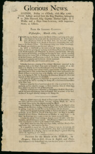 The four newspaper-publishing firms, despite representing a wide spectrum of political opinion, banded together, and at their own expense jointly issued a broadside calling for a celebration of the “Glorious News” (Figure 4). The broadside was printed and distributed free to the public at the publishers’ respective offices.