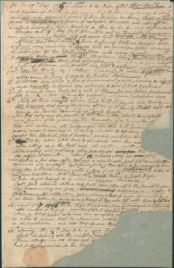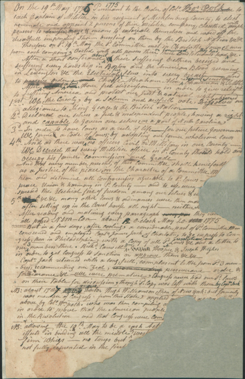 Although any original copies of the MeckDec were lost in the 1800 fire, a number of secondary papers survived. One was given to partisan leader (and later North Carolina governor) William R. Davie (called the “Davie Copy”). A second are some surviving papers of McKnitt Alexander himself. These fragmentary and rough notes, although undated and torn, communicate a clear picture of the events of May 19–20. For example, “after a short conference about their suffering brethren besieged and suffering every hardship in Boston and the American Blood running in Lexington,” McKnitt Alexander wrote, “the Electrical fire flew into every breast,” and “by a solemn and awfull vote, [we] Dissolved (abjured) our allegiance to King George and the British Nation.”[28]