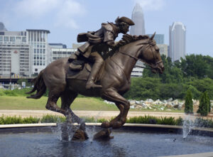 Notwithstanding a great deal of disinterest or disbelief, even in the local community, about the veracity of the story, the date May 20, 1775 graces the North Carolina flag as well as the official state seal. Four sitting American presidents have visited Charlotte over the last century for the annual commemoration (Presidents Taft, Wilson, Eisenhower and Ford). North Carolina has a popular “First in Freedom” license plate, dedicated to both the MeckDec and the later Halifax Resolves. Fly through the Charlotte Douglas International airport and you may pass a bar called Captain Jack’s Tavern (named for a major protagonist in the story), which serves a popular beer called Captain Jack. A bronze 1:5 scale equestrian statue of Captain Jack himself (unveiled in 2010) stands not far from downtown along a much-trafficked greenway on what is called the Trail of History: thus far eleven bronze statues of notable county figures.[1]