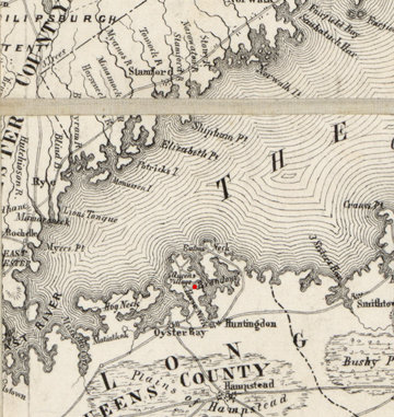 The view of Oyster Bay and the surrounding countryside was delightful; Towards evening, the rich fields of Huntington were reached, stretching picturesquely around a wide bay (Brandon’s Bay). The left wing extended to the left onto a peninsula that seemed to reach far into the Devil’s Belt (Sound), dotted with lovely country houses. The right wing remained before the town.[13]