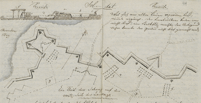 The memoirs by Johann Wilhelm von Krause are a collection of journals spanning the years 1757 to 1798. They are titled, “Johann Wilhelm von Krause Memories.”[5] Historically, von Krause enlisted in the Anhalt-Zerbst military due to financial need in 1781, and his memoirs describe him as being an artillery lieutenant. Volume VI of the collection, titled “Sea Voyage,” records his life from April 1782 to April 1783, including his deployment to North America in the Revolutionary War.[6] He wrote all his memoirs in 1815-16 but that he relied on journals that he kept daily from when he was younger.[7] The memoirs are a recording of the author’s travels and his military duties. They go into great detail about his involvement in designing and defending a fortification at Brandon’s Bay on the north shore of Long Island. The memoir appears to be the only record of the events that happened in the area.