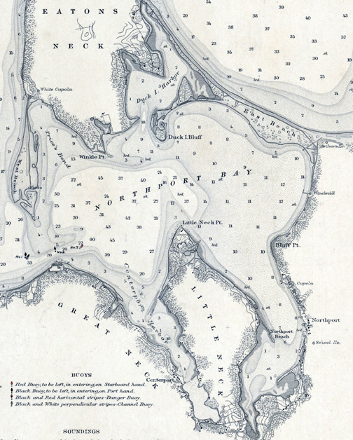 Great Cow Harbor is navigable for vessels of 200 tons burden or more. Here common tides rise and fall about 8 feet and the highest not less than 12 feet. This is the best harbor anywhere about Long Island. Little Cow Harbor (Centerport) and Huntington Harbor are much shallower. They will admit vessels of about 70 tons.[22]