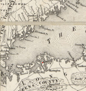 Brandon’s Bay or Brandon’s Harbour is shown on several seventeenth- and eighteenth-century Long Island maps. They all denote Brandon Bay as the waters of Huntington and Northport Bays of today. The left wing mentioned was the British encampments which extended into West Neck and Lloyd’s Neck.