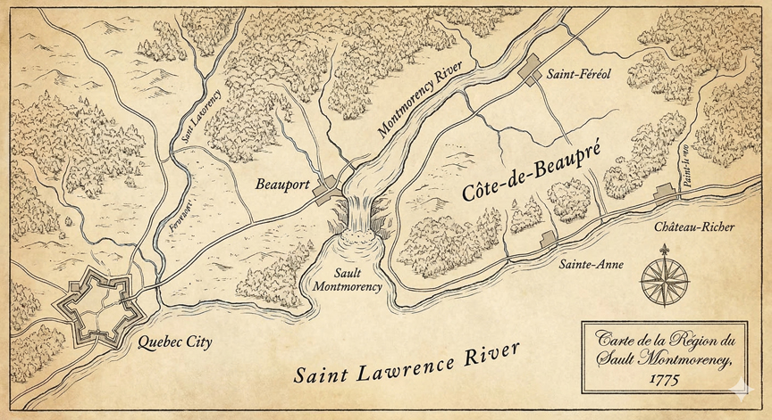 As the journal defines the charges against Lacroix, the landscape of Sault Montmorency defines what his “guard dut”’ meant in practice. The second specific charge against Lacroix was that “He stood guard at Sault.”[17] To the modern eye, this might appear a minor detail, but geographically and tactically, it places Lacroix at the fulcrum of the siege of Quebec.